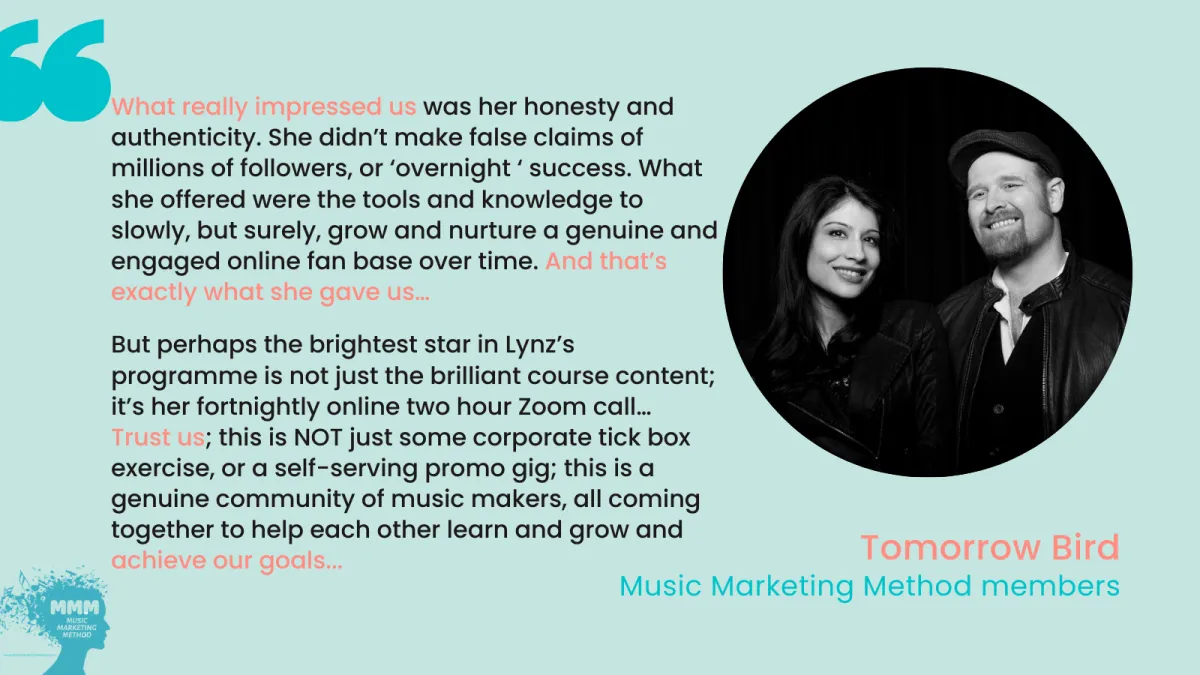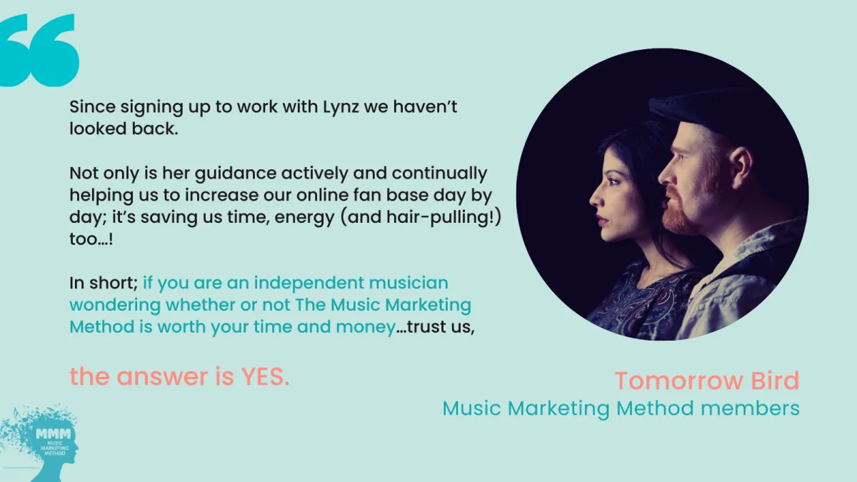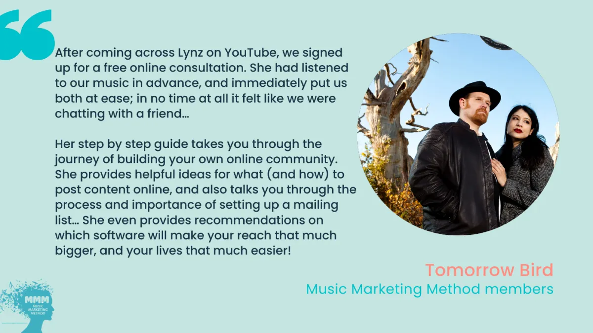The Music Marketing Method is a no-fluff blueprint to help independent musicians find the perfect audience for their music, grow a superfan community and make money with their passion.